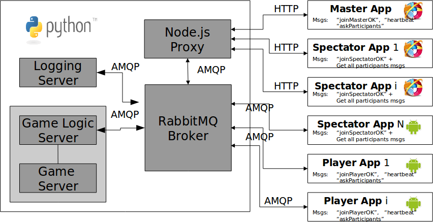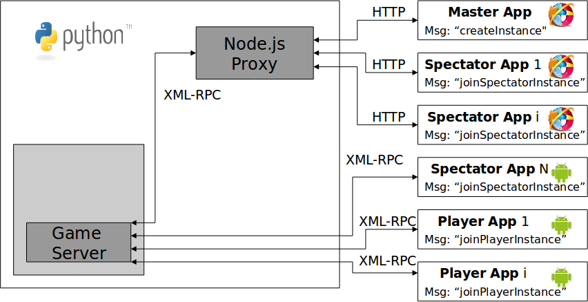 - A master (Android/Java J2SE/Javascript application), which manages (start, terminate...) a game instance
